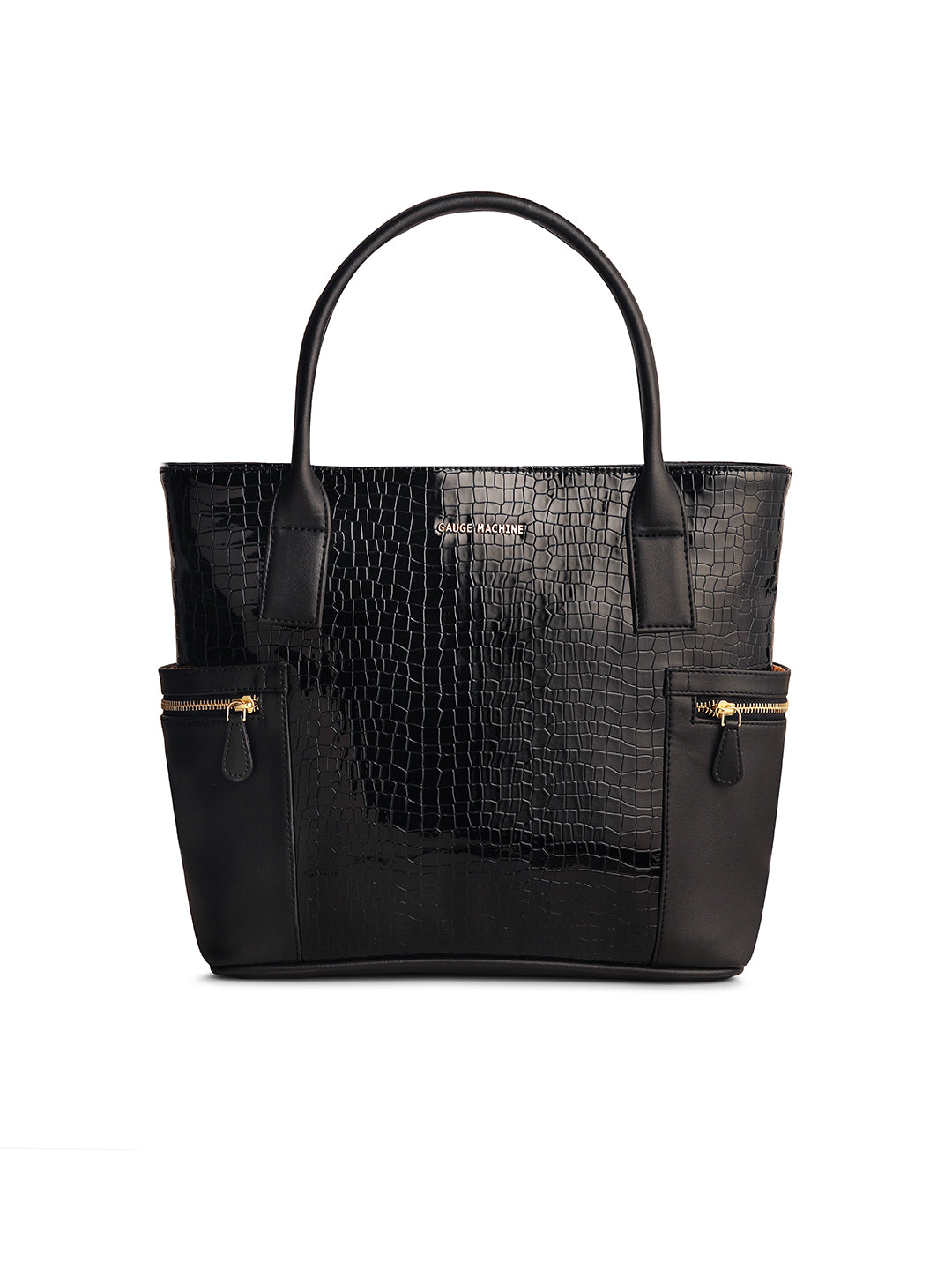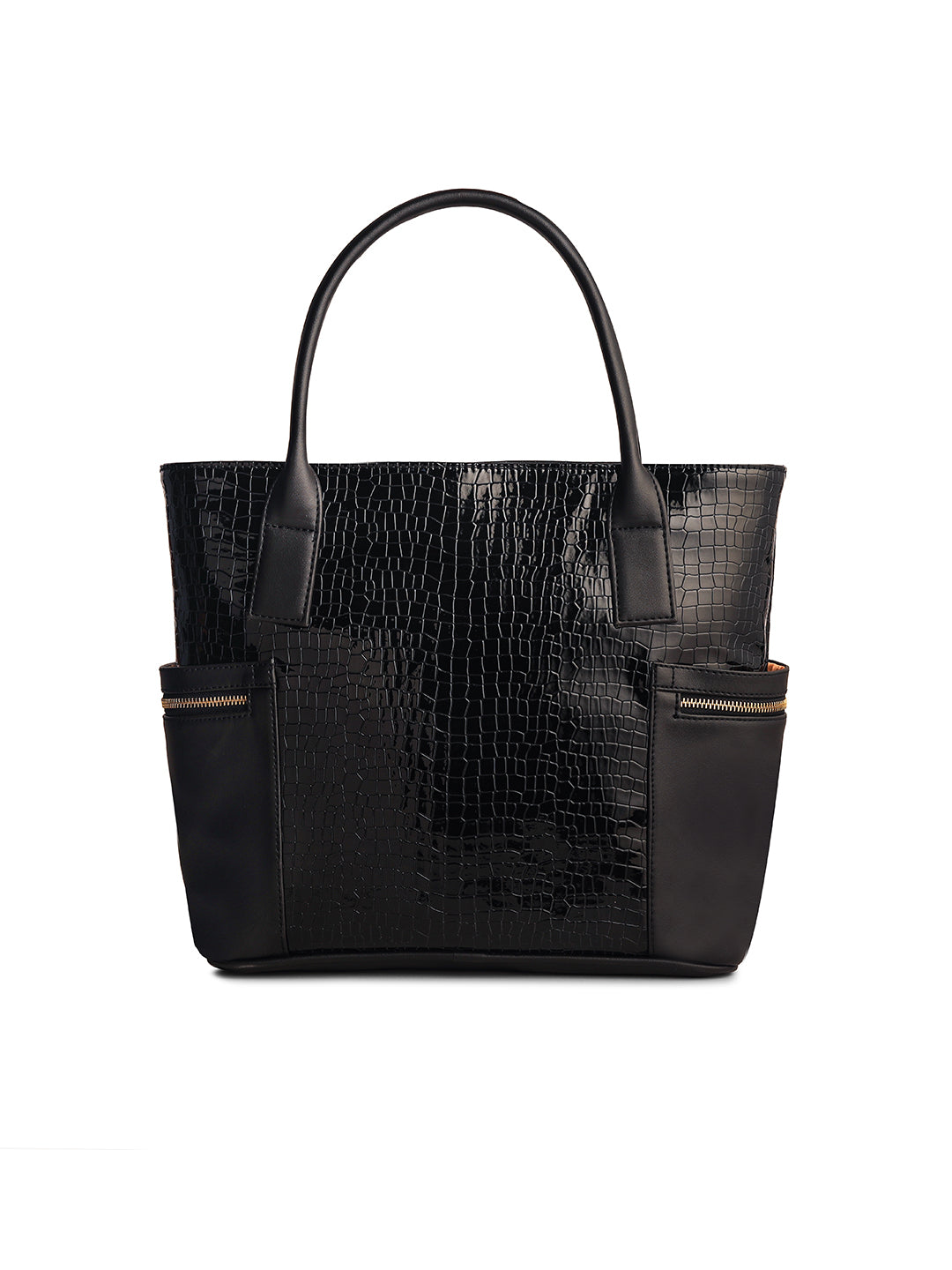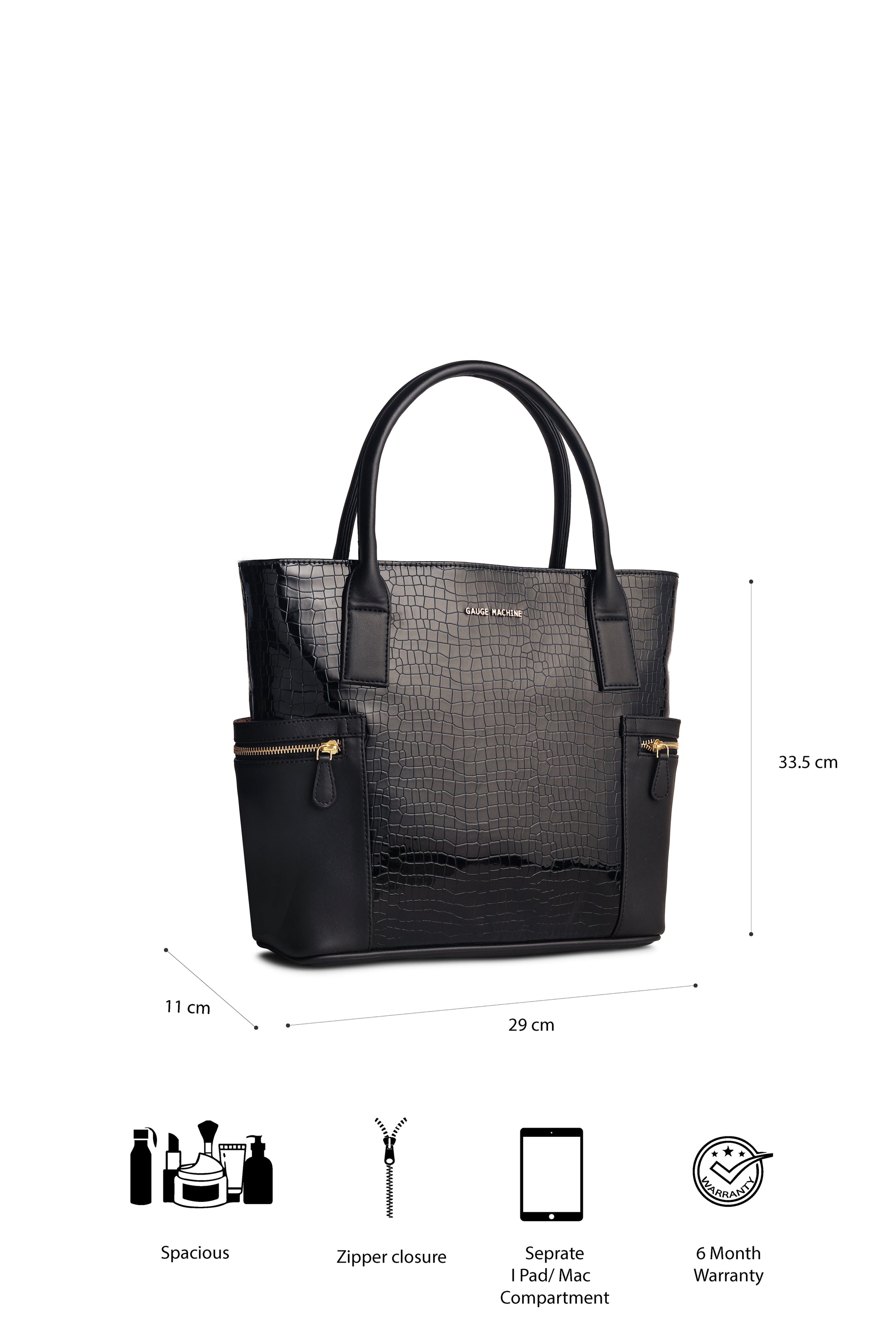 Indulge in pure luxury with our Black Patent Croco Laptop Tote Bag, a masterpiece of sophistication. Adorned with a zipper closure. Featuring a regal front zipper pocket and a plush interior with slip-in and zipper compartments, this tote is a symbol of refined living. With six meticulously crafted compartments, it transcends mere functionality to become a statement of unrivaled elegance. Elevate your professional look with this exclusive accessory