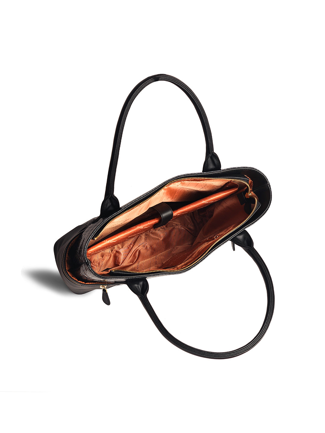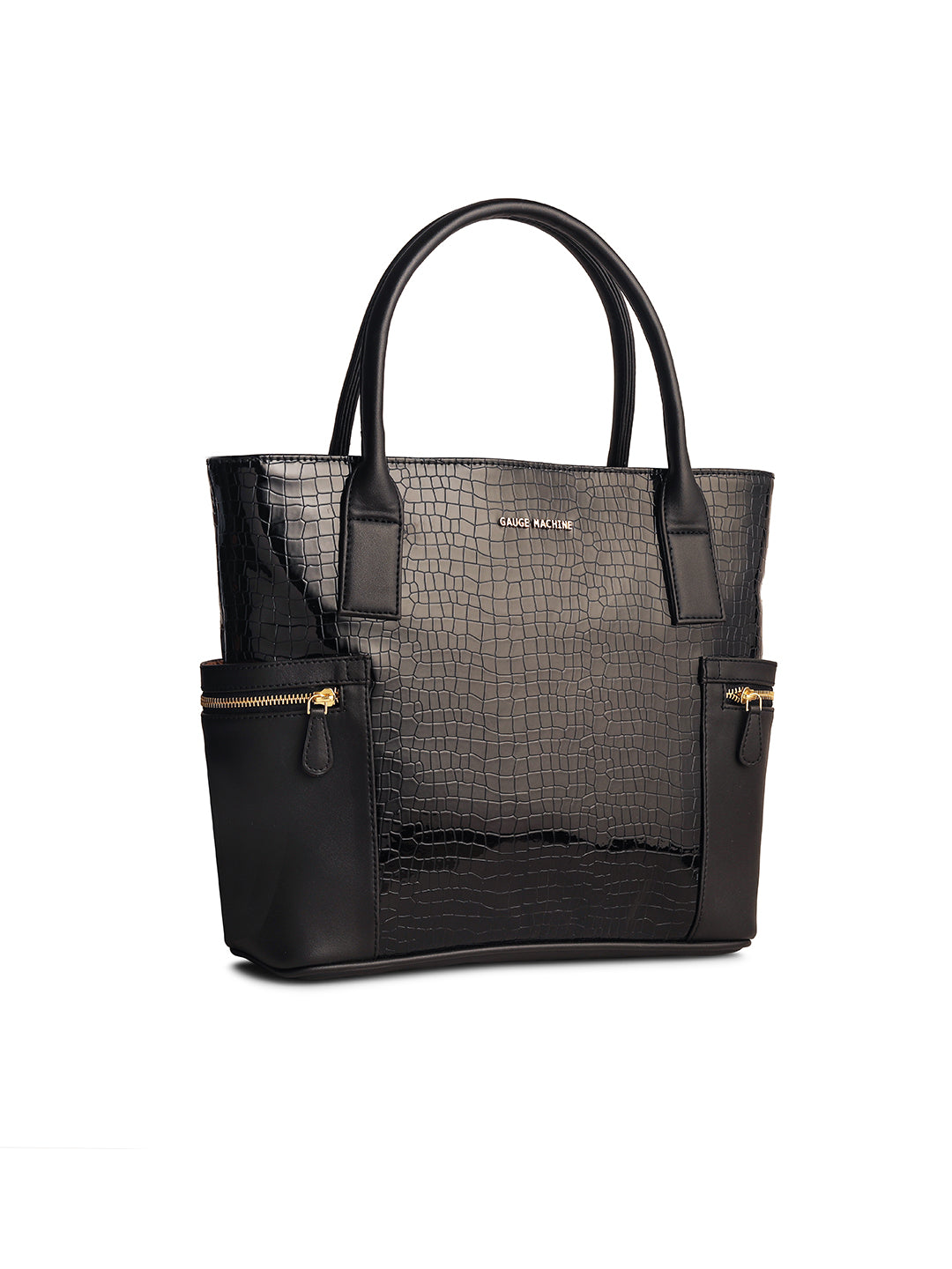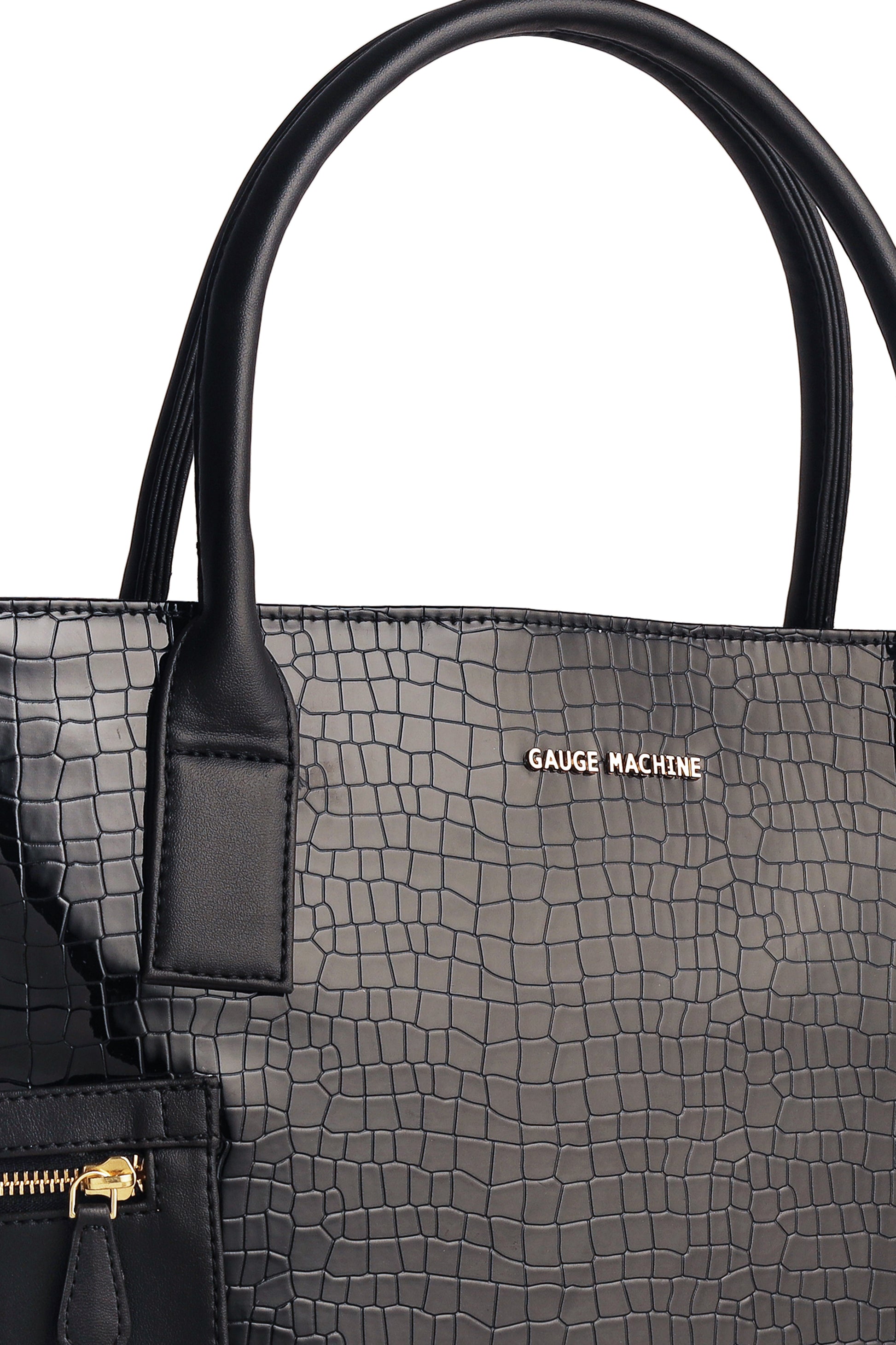 Indulge in pure luxury with our Black Patent Croco Laptop Tote Bag, a masterpiece of sophistication. Adorned with a zipper closure. Featuring a regal front zipper pocket and a plush interior with slip-in and zipper compartments, this tote is a symbol of refined living. With six meticulously crafted compartments, it transcends mere functionality to become a statement of unrivaled elegance. Elevate your professional look with this exclusive accessory