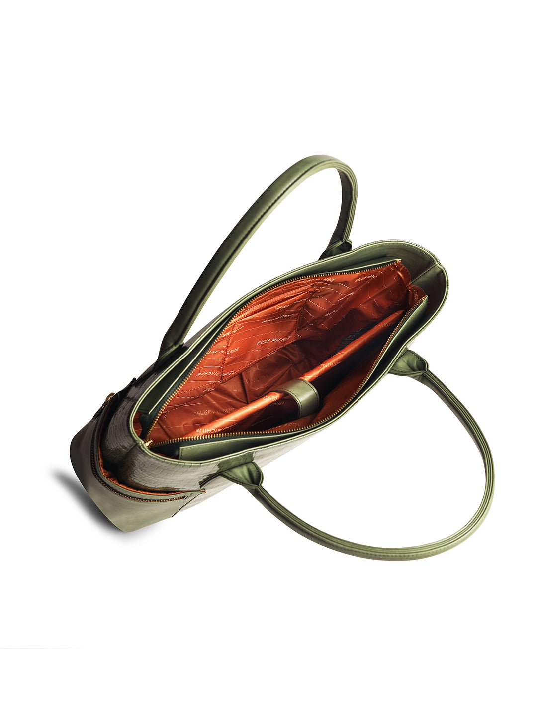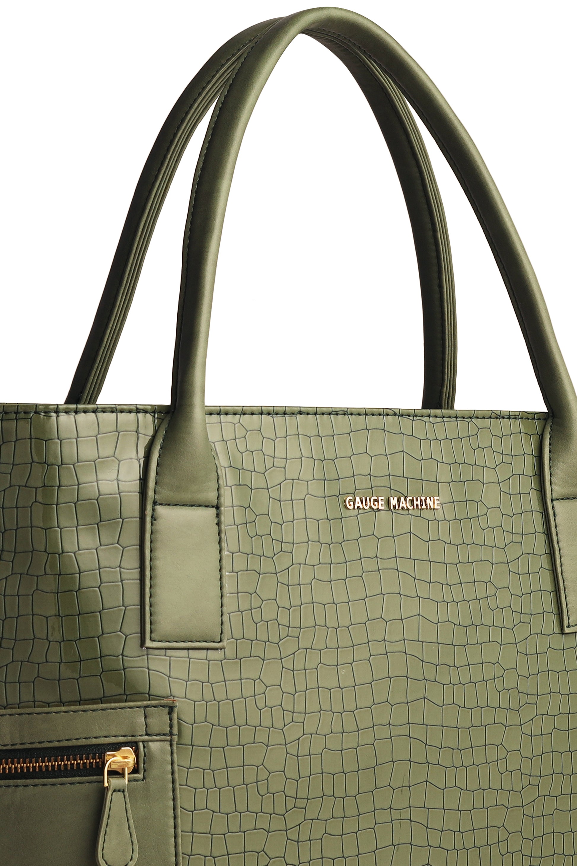 Indulge in pure luxury with our green Patent Croco Laptop Tote Bag, a masterpiece of sophistication. Adorned with a zipper closure. Featuring a regal front zipper pocket and a plush interior with slip-in and zipper compartments, this tote is a symbol of refined living. With six meticulously crafted compartments, it transcends mere functionality to become a statement of unrivaled elegance. Elevate your professional look with this exclusive accessory
