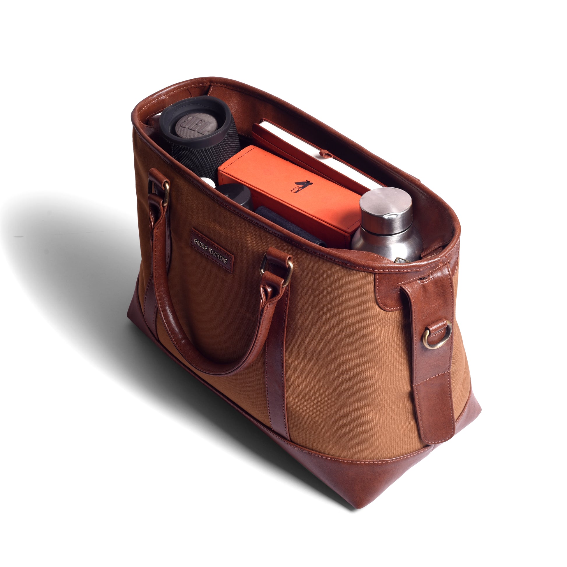 This office friendly carry-case of beige and brown, within its singular compartment, aided by an elongated zipper pocket, can carry all your work and food supplies that you’d need throughout the day.This sturdy bag comes with an easy-to-undo detachable strap to shift swiftly from rushing to pacing to get where you want to be, with all your stuff packed inside the water repellent conceal.